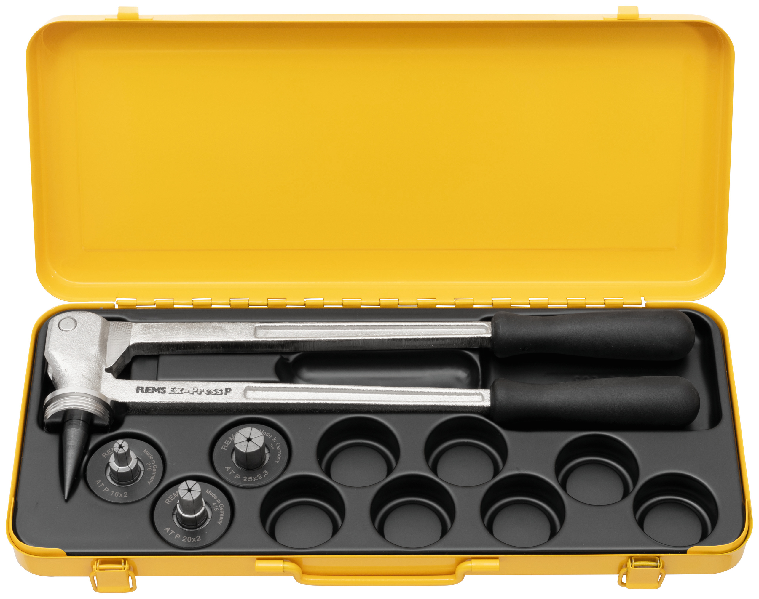 REMS Экс-Пресс П Набор. Ручной труборасширитель для пластиковых и композитных труб диаметром 12 - 32 мм. Расширительные клещи REMS Экс-Пресс П. Расширительные головки Р для труб в мм. В прочном ящике из листовой стали.