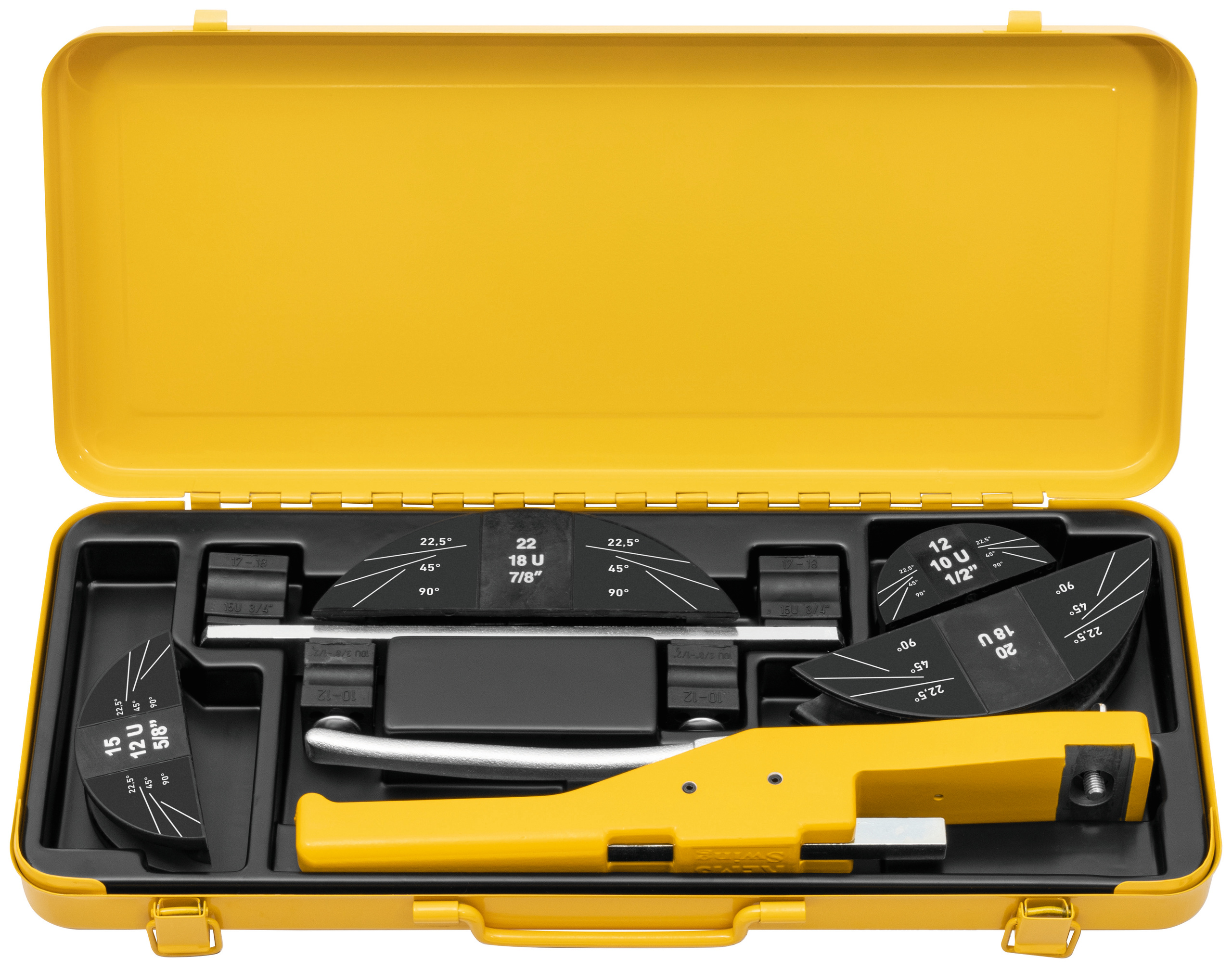 Диаметр трубогиба для одной руки. 10 - 32 мм, диаметр 3/8 - 7/8 дюйма, до 90 градусов. Мягкие медные трубы диам. 10 - 22 мм, диаметр 3/8 - 7/8 дюйма, макс. 1 мм, медные трубки с мягким покрытием, диам. 10 - 18 мм, диаметр 3/8 - 5/8"", s макс. 1 мм, трубы из стали C с мягким покрытием для систем пресс-фитингов Dm. 12–18 мм, диаметр макс. 1,2 мм, диаметр труб из мягкой прецизионной стали. 10 - 18 мм, макс. 1 мм, композитные трубы диам. 14 - 32 мм. До ДМ. 26 мм с приводным устройством, гибкими сегментами, держателем ползуна диаметром S. 10–26 мм с ползунками, в прочной коробке из листовой стали. До ДМ. 32 мм с приводным устройством, гибкими сегментами, 2 опорами ползуна диам. 10 - 26 мм и диаметр. 32 мм с ползунками, в прочном кейсе.
