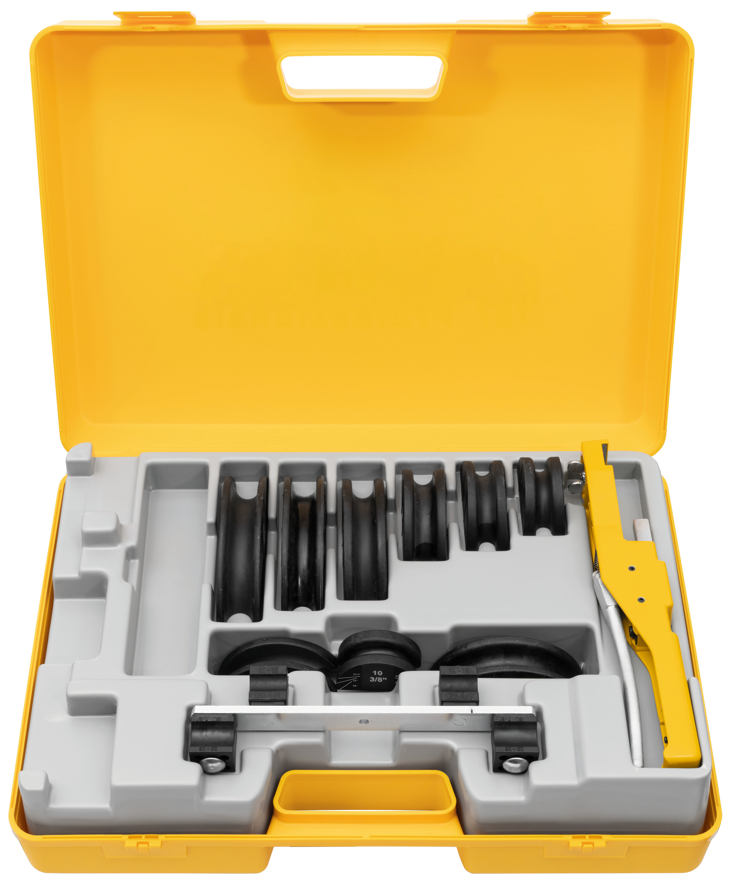 Диаметр трубогиба для одной руки. 10 - 32 мм, диаметр 3/8 - 7/8 дюйма, до 90 градусов. Мягкие медные трубы диам. 10 - 22 мм, диаметр 3/8 - 7/8 дюйма, макс. 1 мм, медные трубки с мягким покрытием, диам. 10 - 18 мм, диаметр 3/8 - 5/8"", s макс. 1 мм, трубы из стали C с мягким покрытием для систем пресс-фитингов Dm. 12–18 мм, диаметр макс. 1,2 мм, диаметр труб из мягкой прецизионной стали. 10 - 18 мм, макс. 1 мм, композитные трубы диам. 14 - 32 мм. До ДМ. 26 мм с приводным устройством, гибкими сегментами, держателем ползуна диаметром S. 10–26 мм с ползунками, в прочной коробке из листовой стали. До ДМ. 32 мм с приводным устройством, гибкими сегментами, 2 опорами ползуна диам. 10 - 26 мм и диаметр. 32 мм с ползунками, в прочном кейсе.